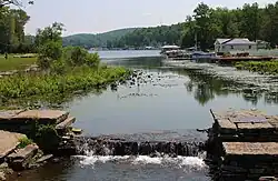 The shoreline of Harveys Lake is entirely surrounded by a paved road, which is atypical for a lake shoreline. Homes and cottages are situated on the road opposite the lake,[3] and significant development has occurred in the vicinity of the lake.[11] A ditch and outlet drainage structure made of concrete at Wardens Place drains into the lake; its purpose is to control small-scale local road flooding.[12]