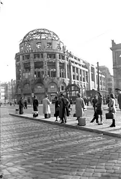 In the Nazi years, the mix of restaurants was modified and the Jewish Kempinskis had to sell the building for a pittance to "Aryans" and leave the country.[29] A 1936 French film, Les Loups entre eux (English title: The Sequel to Second Bureau), features scenes in Haus Vaterland, including "the Horst Wessel song booming from the loud-speaker".[35][36] The business continued to host throngs of customers even after Berlin began to suffer heavy bombing by the Allies. In 1943 the building was damaged, particularly in the central section, in the British night Air-raid on the nights of 22 and 23 November that destroyed much of the centre of the city including the department store KaDeWe..[37] On 3 February 1945 it was bombed out by the U.S.A.A.F. during a daylight raid, only the walls left standing.[29]