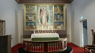 Like most other churches in Finnmark, Havøysund church was burned down by the Germans during the evacuation of Finnmark in 1944. The new church was built of whitewashed concrete and dark wooden timbers in a long church style in 1960 using plans drawn up by the architect Esben Poulsson. The altarpiece and pulpit decoration were painted by the artist Terje Grøstad. The church seats about 300 people.[2][3][4]