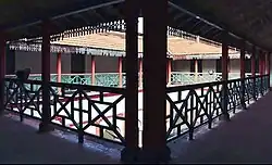 There are two octagonal shaped guard rooms on the front side of the palace that were guarded by sentries. After independence, a large portion of the palace was taken over by the government in order to build the Beach Road. Two cannons were placed on top of the guard rooms and two Grecian statues of sentries were placed on both sides of the finely crafted wooden main gate. Reportedly, this wooden gate took one and a half year to construct.[3]