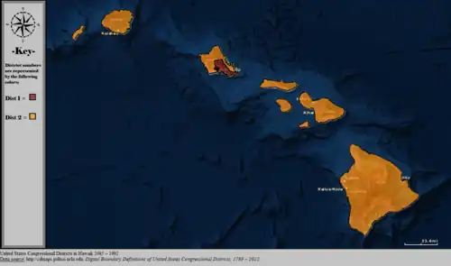 Table of United States congressional district boundary maps in the State of Hawaii, presented chronologically.[5] All redistricting events that took place in Hawaii between 1973 and 2013 are shown.