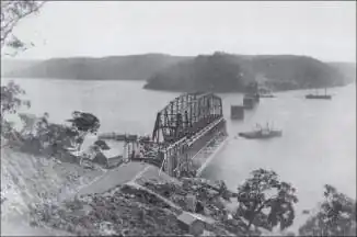 The Union Bridge Company of New York was awarded the contract to construct the bridge in January 1886. The railways engineer-in-chief, John Whitton, who designed and built the railway was not invited to design the bridge due to fallout from a mid 1880s enquiry into railway bridges.[1] However, subcontractors were also involved in the actual construction work. The piers consisted of concrete below water with sandstone masonry above. The spans were assembled on Dangar Island and floated 1,500 metres (4,921 ft) or so across to the bridge site on barges.