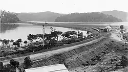 Whilst the main line terminated at Hawkesbury River, an arrangement of trackwork, sidings and platforms was provided on the causeway formed by reclaimed land on the eastern side of Long Island where the new Long Island tunnel had been constructed. The station was known as River Wharf and the tracks terminated at a wharf at the edge of the waterway. The purpose of the arrangement was to allow transhipment between the railways and river ferries, thus allowing passengers to cross the waterway, to another wharf on the northern side of the river, while the Hawkesbury River Bridge was under construction.[4] Hawkesbury River became a popular destination for day trippers and fishermen, outstripping the capacity of the original timber platform building. This was replaced in 1903 with the current brick building, which is of the type that had recently been adopted as the standard construction for island platforms.[5]
