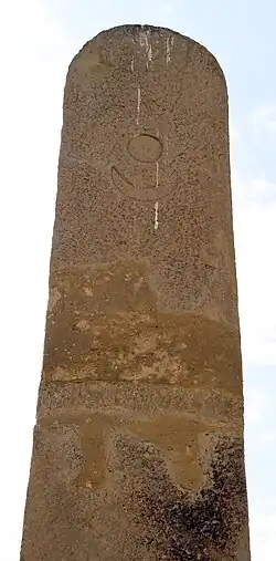 The Hawulti monument is 5.5 metres (18 ft) high, with a disk and crescent at the top; Edward Ullendorff believes these symbols "no doubt meant to place the stele under the protection of the gods, probably of Šams, the Sun goddess, and of Sin, the Moon god". These pre-Christian symbols, as well as paleographical characteristics such as the lack of vowel marks in the Geʽez script, convinced Ullendorff that the monument dated "to the early part of the fourth century A.D."[2]