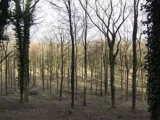 The tree-covered Head Down rises about 1 kilometre south of the village of Buriton in Hampshire.[2] It lies within the eastern part of the Queen Elizabeth Country Park and is described as "an area that caters for clubs that require land with privacy for outdoor recreational activities, such as archery or off-road vehicles."[3]