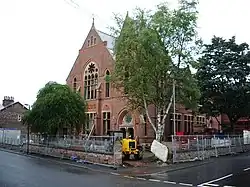 It was designed by Alfred Waterhouse in the Gothic Revival style and completed in 1881. Built of red brick with stone dressings it has steep slate roofs. The NHLE listing describes the church as a "good and complete example of the work of Waterhouse, economically planned and sensitively detailed".[1] Original staircases, doors and interior fittings intact. Unusually the ground floor is occupied by a school room with the church on the first floor. It is believed to be the only church in the United Kingdom designed in this manner.[2]