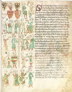 The Heerschild (German: [ˈheːɐ̯ˌʃɪlt]; Latin: clipeus militaris[1]), also called the shield of knighthood,[2] in the Early Middle Ages was the right to raise a feudal levy of troops. The call to do so was the Heerbann. The resulting importance of a system of military ranks, based on the ability to provide men for a campaign, became modified in the law books published in the 13th century. It finally ended up as being an important part of the structure of medieval society, as captured in the feudal law element of the Sachsenspiegel by Eike von Repgow.