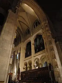In 1888, a design competition for the Cathedral of St. John the Divine, the most prominent project of its kind in the U.S., was entered by 68 architectural firms, and won in 1891 by Heins & LaFarge, with an eclectic design, based on Romanesque forms but with many Byzantine and Gothic elements, dominated by a massive spired tower over the crossing. The cornerstone was laid December 27, 1892, but unexpectedly, massive excavation was required before bedrock was hit. Heins & LaFarge completed the east end and the crossing, temporarily roofed by Rafael Guastavino with a tiled dome (still standing). The Chapel of St. Columba was consecrated in 1911, but the death of Heins ended the contract with Heins & LaFarge. Some of the Cathedral trustees did not care for the original Romanesque-Byzantine design, preferring something more purely Gothic, and consequently they removed the project from LaFarge, the surviving architect of the team.[2] They hired a new architect Ralph Adams Cram, whose nave and west front would be continued in French Gothic style.