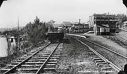 Helensville South was the original terminus from Thursday, 28 October 1875,[16] when the 16.5 mi (26.6 km) Kaipara – Riverhead line opened, with a daily train each way from Friday, 29 October.[17] It was near Rimu Street,[18] 0.7 km (0.43 mi) south of the later Helensville station.[2] A Kaipara River wharf, accessible only at high tide,[19] was built in 1872 and a goods shed and station house in 1873. Initially journeys were slow, as there was no ballast, sleepers being held only by clay and fern. On 25 July 1876 Helensville South was described as a temporary station. The town grew up close to the old station, so that there was opposition to closing it. In October 1880 a petition asked for a small platform and in July 1881 another petition opposed closure. Therefore, on 9 February 1881, when the new terminus opened, the old Helensville station became Helensville South flag station. A platform was built later that year, a ticket office in 1884, by which time there was also a cart approach, and a shelter shed in 1887. By 1896 there were also urinals and private sidings for Helensville Timber Co and Waitemata County Council, with a siding for Kaipara Dairy added when their factory opened in 1911, on the site of a sawmill.[20] In 1912 a 20-ton weighbridge was added.[21] A light was added in 1921.[22] The Mill Road level crossing was replaced by a bridge in 1938.[23] By 1978 only a shelter shed remained.[21] Both stations lost their passenger trains to the north from 31 July 1967, general goods traffic from 9 July 1978 and Auckland suburban trains from 30 November 1980.[1]