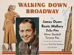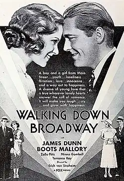 Erich von Stroheim was hired by Fox Films to write and direct a film under the working title of Walking Down Broadway.[1] On September 2, 1931, Fox executive Winfield Sheehan approved the project on several conditions. One was that von Stroheim, who was known for filming excessive footage, would be limited to shooting 85,000 feet of film, or 95 minutes of screen time.[2]