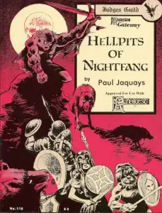 Chaosium published the fantasy role-playing game RuneQuest in 1978. The following year, Judges Guild released a RuneQuest adventure, Hellpits of Nightfang, written by Jennell Jaquays[a], who also created the cover art for the 32-page book.[1]
