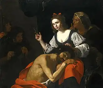 De Somer is believed to have been in contact with Matthias Stom during the latter's stay in Naples in the 1630s. Hendrick's works such as Caritas Romana (1635, private collection) and Tobias curing his father's blindness (c. 1635, Banco Commerciale Italiana, Collezione Intesa Sanpaolo) can be seen as de Somer's reaction to the northern realism of Matthias Stom.[12] In later compositions de Somer reflects influences deriving from the example of other Neapolitan masters who asserted themselves in those years, such as Massimo Stanzione and Bernardo Cavallino. Hendrick's palette moved gradually away from the tenebrism of Ribera and opened up to the neo-Venetian color, which in that period came to replace the chiaroscuro of the Caravaggisti.[6] Works like his multiple versions of Lot and his daughters and his Samson and Delilah are examples of this evolution.[12]