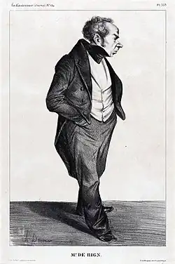 Called in 1831 to the Chamber of Deputies by a double election, Admiral Rigny received, on 3 March that year, king Louis-Philippe, the portfolio of the navy. Assigned on 4 April 1834, the Department of Foreign Affairs, he started that administration of a new activity. On 12 March 1835 his health became increasingly unsteady, forcing him to resign his ministerial duties, but in August, he accepted a short mission to Naples. He was barely back in late October, when he felt the first attacks of which he succumbed on the night of 6 to 7 November 1835 at the age of 52 years. After his death, his widow gave birth to a daughter, Amelia Marie Gaultier Rigny, born on 7 February 1868. She married Baron Verneaux and died on 6 July 1868 at the Chateau de Ris Ris-Orangis. The Countess of Rigny, his mother also died at the Chateau de Ris on 13 November 1875.