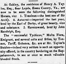 Thoroughbred Stud and Sales Henry A Tayloe Oakley Essex Co VA Phenix Gazette Thu Aug 15 1833