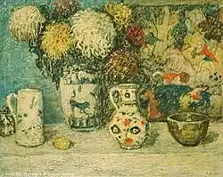 After 1912, he altered his technique and painted with broken colors, changing his subjects from the moody landscapes of Long Island and Montreuil to still life and figurative subjects in a style reminiscent of Adolphe Monticelli.[9] Such a style change was marked by his request to the Metropolitan Museum of Art in 1915 to replace his earlier work with his recent figure painting. Although his late works include portraits and genre subject, his most numerous works of this period were paintings of rock pools in Brittany.[10] The canvases were highly colored; the pigment thickly applied with impressive decorative effect of the compositions. In his final days, Dearth frequently used objects from his substantial collection of Gothic, Renaissance, and Eastern artifacts as his subjects or as backgrounds.[3][4] His final pictures incorporated important Japanese screens, early Chinese paintings, and stone carvings of the Wei period in still life arrangements or as backgrounds for some finely modeled figures.