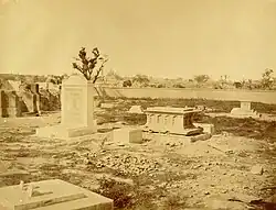 He was buried that same evening in a soldier's grave, and it is said that not a single officer saw the lowering of his body into the ground so furious was the fighting raging at the time.[32] When Lawrence was critically injured and aware he was dying, he gave final orders to his nominated successor at Lucknow, Major John Banks, who immediately recorded them in writing. The twelfth among his fourteen directions was "Put on my tomb only this; Here lies Henry Lawrence who tried to do his duty."[37] This epitaph appears on his tombstone at the Residency graveyard.
