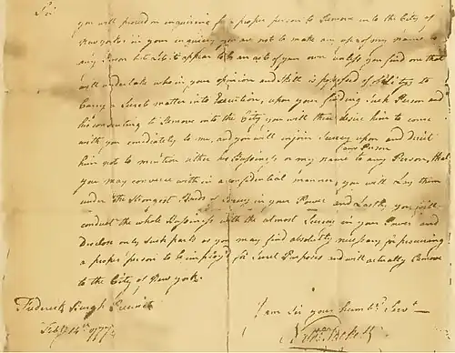 Ludington was commissioned a lieutenant in recognition of his service. He resigned at the enactment of the Duties in American Colonies Act in 1765.[5] He was affiliated with George Washington's intelligence in the American Revolutionary War;[3][4][8] the military commander Nathaniel Sackett asked Ludington for help to furnish spies in Dutchess and Westchester Counties, New York, to gather information on British activities.[3]