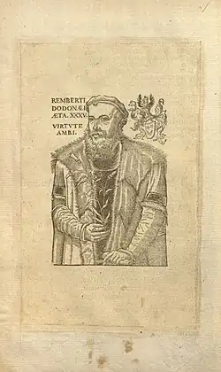 Lyte's first and most important work was his translation of the Cruydeboeck of Rembert Dodoens (Antwerp, 1554) by way of the 1557 French translation of Charles de L'Ecluse (Histoire des Plantes). His copy of the French edition endorsed on the title page "Henry Lyte taught me to speake English" is now in the British Museum. It bears numerous annotations in Latin and English in his neat handwriting, including references to the works of Matthias de Lobel and William Turner.[3] The first edition of the translation was printed in folio at Antwerp, to secure the woodcuts of the original; the blocks being too heavy and valuable to transport. It has 779 pages and 870 cuts, about thirty of which are original, and is mostly in blackletter. It bears the title, A niewe Herball or Historie of Plantes. . . . first set foorth in the Doutche or Allmaigne tongue by that learned D. Remburt Dodoens, Physition to the Emperour: And now first translated out of French into English by Henry Lyte, Esquyer. At London by me Gerard Dewes, dwelling in Pawles Church-yarde, at the signe of the Swanne, 1578. On the back of the title-page is Lyte's coat of arms and a crest, "a swan volant silver upon a trumpet gold," which was not actually granted him by Clarenceux King of Arms uпtil the following year. This is followed by a dedication to Queen Elizabeth, dated from Lytes Сarу, commendatory verses, and a portrait of Dodoens. Lyte added very little original matter to the text. A second edition, without any woodcuts, was printed in London by Ninian Newton, in square octavo, in 1586, and a third by Edmund Bollifant, in the same size, in 1595. A folio edition, also without woodcuts, was published by Edward Griffin in 1619.[2]