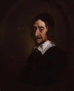 Although a leading Puritan, Marten enjoyed good living. He had a contemporary reputation as a heavy drinker and was widely said to be a man of loose morals.[2] According to John Aubrey he was "a great lover of pretty girls to whom he was so liberal that he spent the greatest part of his estate" upon them.[9] In the opinion of King Charles I he was "an ugly rascal and whore-master".[10] He married twice (to Elizabeth Lovelace, daughter of Richard Lovelace, 1st Baron Lovelace; and Margaret Staunton, née West) but had an open and lengthy relationship with Mary Ward, a woman not his wife, by whom he had three daughters.[11] Ward ultimately was to remain with him throughout his later imprisonment.[4] His enemies branded him an atheist but his religious views were more complex, and influenced his position regarding the need to allow freedom of worship and conscience.[12] His political views throughout his life were constant: he opposed one-man rule[13] and was in favour of representative government. In 1643, even while the king was losing the First Civil War and Parliament's cause was beginning to triumph, Marten's republican sentiments led to his arrest and brief imprisonment.[14] Thus for his time Marten was unusual in his political stance, being unashamedly in favour not of reforming the monarchy but of replacing it with a republic.[15]