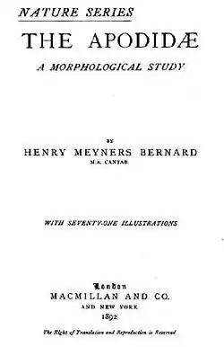 Henry Meyners Bernard (29 November 1853 in Singapore – 4 January 1909 in London) was a British biologist, carcinologist, palaeontologist, mathematician and cleric, and an authority on solifuges, corals and trilobites.[1][2] He was the third of six children born to Alfred George Farquhar Bernard and Elizabeth Antoinette Moor.[3][4]