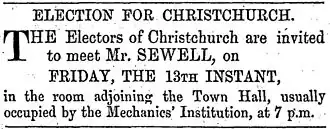 Sewell's diary, published in 1980 as the Sewell Journal in two volumes, gives a unique insight into his life in the colony. The journal's editor, historian W. David McIntyre, calls it "the most absorbing and undoubtedly the fullest private manuscript relating to New Zealand in the 1850s".[6] In late July 1853, Sewell decided that he would stand for Parliament in the 1853 general election; the question was whether he should run in the Town of Christchurch or the Christchurch Country electorate.[7] There was one position to be filled in the town electorate, and two in the rural electorate.[8] Sewell sought counsel from some friends, who recommended for him to stand in the rural electorate, but he did not want to oppose Guise Brittan, who had already declared his candidacy. Whilst Brittan was unpopular with the constituency, Sewell thought that it would be useful to have him in Parliament. The complication with the town electorate was that John Watts-Russell had already received a pledge from the majority of that constituency, but there were rumours that he would not stand, and it was known that he was just about to go travelling during the time of the election campaign.[9] Sewell talked to Brittan, who fully supported him standing in the town electorate, and Brittan pledged that he would get his brother-in-law, Charles Fooks, to canvas for him.[9] Sewell first advertised his candidacy in the Lyttelton Times on 30 July.[10] In the same edition of the newspaper, James Stuart-Wortley[10] and Guise Brittan[11] advertised their candidacy for the Christchurch Country electorate. Jerningham Wakefield reiterated his candidacy for the Christchurch Country electorate in early August upon his return from Wellington.[12] At the same time, Fooks announced his candidacy for the Town of Christchurch electorate.[12] With James FitzGerald, who had just been elected the first Superintendent of the Canterbury Province, apparently in support of Watts-Russell, Sewell decided to withdraw from the contest, but decided to go ahead with a public meeting to 'speak his mind'.[13] On 4 August,[14] he held a meeting at the Golden Fleece, a hotel on the corner of Colombo and Armagh Streets,[15] and addressed between 30 and 40 electors. He discussed all the issues that Parliament should deal with, but finished by saying that he would not be available as a candidate, as Watts-Russell had been pledged the support of the constituency. After an awkward period of silence, Richard Packer stood up and replied:[16]
