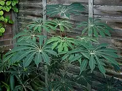 Related to the ivies (Hedera), Heptapleurum taiwanianum is one of several species in the hugely varied genus Heptapleurum that are grown ornamentally for their handsome foliage.[4] Once mature it is hardy down to −10 °C (14 °F), though young plants may require some frost protection. It benefits from being planted in a sheltered spot with other plants to provide enough humidity. It has gained the Royal Horticultural Society's Award of Garden Merit.[5][6]