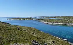 The municipality of Herøy consists of about 1,700 little islands and islets. The main islands are Nord-Herøy, Sør-Herøy, Tenna, Ytre Øksningan, Indre Øksningan, Seløya, and Staulen— all of which are connected by bridges including Åkviksundet Bridge, Hoholmen Bridge, Kalvøyrevet Bridge. Most islands are low and close to the sea surface.[13] The highest point in the municipality is the 119.15-metre (390.9 ft) tall mountain Vardøyfjellet on the island of Vardøya.[1]