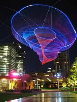Her Secret Is Patience is a public art sculpture commission designed by artist Janet Echelman for the city of Phoenix. Its creation was the result of collaboration between the artist and a team of award-winning engineers, architects, planners, and fabricators. It is located downtown in the Civic Space Park across from the Walter Cronkite School of Journalism at Arizona State University. The sculpture consists of painted, galvanized steel; polyester twine netting; and colored lights. The piece cost $2.5 million.[1][2] The title of the piece is a quote from Ralph Waldo Emerson and during construction it was unofficially titled Sky Bloom.[3]