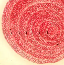 Root cross section (30 μm) of Silene vulgaris. Lignified tissue is stained reddish using Phloroglucinol/HCL. Black markers denote annual ring borders. Individual collected at Davos, Switzerland (2003)