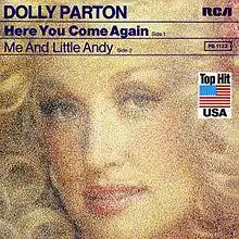 "Here You Come Again" is a song written by Barry Mann and Cynthia Weil, and recorded by American entertainer Dolly Parton. It was released as a single in September 1977 as the title track from Parton's album of the same name, topped the U.S. country singles chart for five weeks, and was nominated for the 1978 Grammy award for Best Female Pop Vocal Performance; it also reached number three on the U.S. Billboard Hot 100, representing Parton's first significant pop crossover hit.