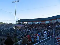 Fan-facing upgrades involved the extension of seating along the left field line, adjacent to and atop the new home clubhouse. Standard field-level seating was extended toward the left field corner, with a rooftop party deck and a premium club lounge built above the clubhouse facility.[24] Renovations expanded seating to a 5,400 capacity, and for the first team, fans can sit in fair territory beyond the outfield wall.