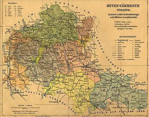 Heves County was recreated again in the newly arranged Hungarian county system of 1876. Its territory after 1876 was broadly similar to its 1850s iteration but with the addition of Tisza-Füred south of the Tisza.