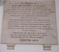 A plaque over the entrance records that the almshouses were built "for Ten poor Men and Ten poor Women by the bounty of William Hickey Esq. Who by his Will bequeathed certain Lands and houses in Richmond in Trust for Charitable purposes".[1] William Hickey,[note 1] who died in 1727 and is buried in an altar tomb in the churchyard of St Mary Magdalene, Richmond, left the income of several properties on Richmond Hill, including The Wick, in trust to provide pensions for six men and ten women.[2][3] In 1822 the charity's funds were boosted by a major donation by Elizabeth Doughty.[4]