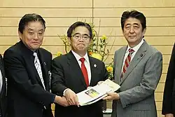 Ōmura with Takashi Kawamura and Shinzo Abe (at the Prime Minister's Official Residence on October 21, 2016)
