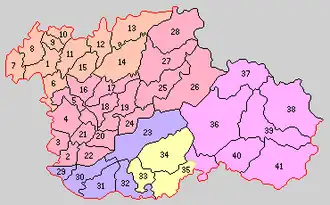 * yellow - areas formerly within the district borders during the early Meiji period