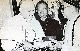 The handing over of a message of Pupe Paul VI by Archbishop Sergio Pignedoli to the Viet Nam's Inter-Faith Council representative Ven. Thich Minh Truc supreme head of the Buddhist General Church.