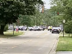 A driver from Waukegan and his passengers spotted Crimo's damaged 2010 Honda Fit southbound on U.S Route 41 near Wadsworth.[18] Over the next 13 minutes, they relayed information to 911 operators. Crimo was stopped by North Chicago and Lake Forest Police units at the intersection of U.S. Route 41 and Westleigh Road in Lake Forest, Illinois, and apprehended without incident at approximately 6:30 p.m., more than eight hours after the shooting began.[6][19]