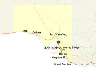 | Major settlements | Millicent, Kingston SE, Murray Bridge, Mount Barker, Adelaide, Port Wakefield, Port Augusta, Ceduna |
