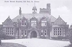 The hospital, which was designed by George Thomas Hine using a Compact Arrow layout, opened as the Hertfordshire County Asylum in April 1899.[1] Hill End railway station, a station on the Great Northern Railway branch from Hatfield to St Albans, was opened to service the hospital in August 1899.[2] The asylum became the Hertfordshire County Mental Hospital in 1920 and the Hill End Hospital for Mental and Nervous Diseases in 1936.[3] During the Second World War patients were evacuated from St Bartholomew's Hospital to Hill End Hospital.[1] It became part of the National Health Service as the Hill End Hospital and Clinic for the Prevention and Treatment of Mental and Nervous Disorders in 1948.[3]