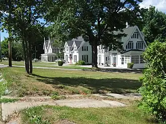 The most visually distinctive of the district's houses are a trio of Gothic Revival buildings on the north side of River Road. Built between 1850 and 1855, they are among the town's most architecturally sophisticated buildings, constructed at a time when the town still had a frontier feel to it. Of these, the George Washburn House and the Alexander Gilmore House are both also individually listed on the National Register for their architecture. The Gilmore House is one of two with a known architect: it was designed by New Brunswick architect Matthew Stead.[2]