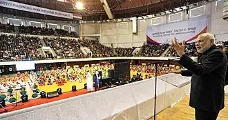 The Art of Living foundation is a spiritual, educational and humanitarian movement that was founded by Sri Sri Ravi Shankar in 1981. The organisation operates in 152 countries and propagates Sri Sri Ravi Shankar's philosophy of peace and compassion.[31] Ravi Shankar teaches the essence of spirituality and promotes Hindu values, practices, systems and traditions.[32] The Art of living is not a religious organisation; It a spiritual one that borrows Hindu practices such as yoga, puja and chanting and Hindu values such as gratitude, love, belongingness and compassion.[33]