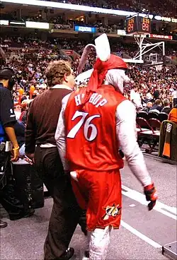 Hip Hop was the mascot of the Philadelphia 76ers basketball team from January 1998 to November 2011. A rabbit character, Hip Hop usually entertained Sixers fans during halftime and time-outs by performing acrobatic slam dunks from a trampoline, often over an item or person, such as a motorcycle, a Sixer Dancer, a fan, or a ladder.