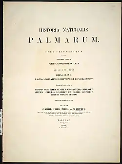 Historia naturalis palmarum: opus tripartitum ("Natural History of Palms, a work in three volumes") is a highly illustrated, three-volume botanical book of palms (Arecaceae) by German botanist Carl Friedrich Philipp von Martius. The work is in Latin and was published in imperial folio format[1] in Leipzig (Lipsiae) by T.O. Weigel, volume one in 1823 and the final volume in 1850. It includes more than 550 pages of text and 240 chromolithographs, including views of habitats and botanical dissections.[2]