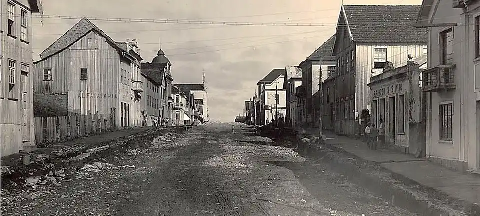 At this time, almost all buildings were made of wood, with few examples in masonry. Even large industrial pavilions were built in wood, with the araucaria being the most used, as it was abundant in the region at the time. The paving of the center would take a long time. Until Colonel José Pena de Moraes took office, the center would have had dirt roads with gravel, and only a few streets with paved sidewalks. The main focus in the first decades was the organization of the Dante Square and Rua Grande, where works for the flattening and lowering of the land began, a process delayed and complicated by the existence of a large quarry in the area.[7][5]