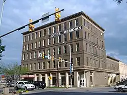 Meridian Downtown Historic District runs from the former Gulf, Mobile and Ohio Railroad tracks north to 6th St between 18th and 26th Avenues, excluding Ragsdale Survey Block 71 on the northeastern tip of the district. The district was created in 2005 to combine two older districts, Meridian Urban Center Historic District and Union Station Historic District.[3] Meridian's city council voted to combine these two districts and the nine blocks between them into one large district, which was added to the National Register of Historic Places on January 16, 2007.[2]