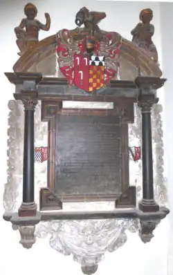 Hearsdon, within the parish of Swimbridge, was anciently a "mansion"[6] and a seat of the Chichester family. A mural monument survives in St James' Church, Swimbridge, to Tristram Chichester (1624–1654) of Hearsdon.[14] He was the second son[15] of Tristram Chichester (1595–1672[16]) (the son of Tristram Chichester[17] (1568–1642[16]) of Hearsdon by his wife Christiana Handford (d.1651) of "Dynnington"[17] in the parish of Swimbridge) by his wife Eleanor (of family unknown) (1603–1647), and was descended from the prominent Chichester family of Hall in the adjoining parish of Bishop's Tawton, itself a junior branch of Chichester of Raleigh, Pilton, near Barnstaple. He married a wife unknown[18] by whom he had four daughters, mentioned in his will but not by name.[17] The monument displays at the bottom the arms of Chichester (with crescent for difference of a second son), impaling the arms of his wife (Sable, a fess vair) and the two arms again on separate shields. Partly behind his head on a smaller shield appear the arms of Chichester impaling: Paly of six argent and gules, on a chief of the second three mascles conjoined in fess of the first (unknown family[19]).