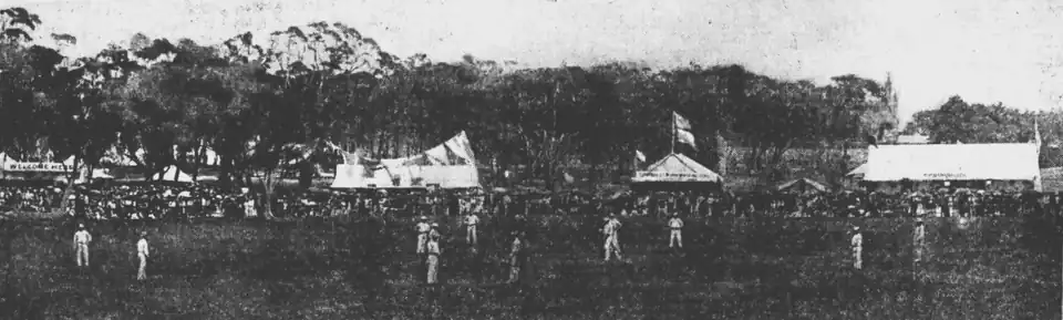 Cricket soon became a very popular sport in Australia, especially in the south-eastern colonies.[1] In Sydney, the Military Cricket Club played games in the 1830s against the Australian Cricket Club, including one at Hyde Park in 1833[2] and the Racecourse in 1834,[3][4] as well as against an Australian civilian XI in 1834.[5][6] In rural New South Wales, the Queanbeyan District Cricket Club was officially formed in 1863[7] having played games against teams from local towns through the 1850s.[8][9][10][11][12] first-class status was achieved as early as the 1850s.