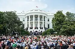 2016 Clemson Tigers football team behind the President visiting the White House in 2017.