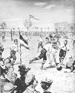 Konrad Koch, a progressive teacher of German and classical languages at the Martino-Katharineum grammar school in Braunschweig, was the first person to succeed in dispelling the reservations about football.[1] In 1874 Koch and his colleague August Hermann organized what is believed to be the first-ever football match in Germany, between pupils from their school Martino-Katharineum.[2] In 1875, Koch presented the first football rules for this new game in Germany and founded the first football club in Germany at his school in the same year.[3] Until 1893, however, the rules were still based on the variant known today as Rugby football.