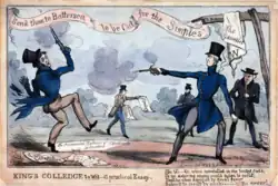 The result was a duel in Battersea Fields on 21 March 1829.[6][34] Winchilsea did not fire, a plan he and his second almost certainly decided upon before the duel; Wellington took aim and fired wide to the right. Accounts differ as to whether Wellington missed on purpose. Wellington, noted for his poor aim, claimed he did, other reports more sympathetic to Winchilsea claimed he had aimed to kill.[35] Honour was saved and Winchilsea wrote Wellington an apology.[33] "Duel Day" is still celebrated on the first Thursday after 21 March every year, marked by various events throughout King's, including re-enactments.[34][36]